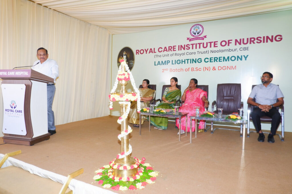 ராயல் கேர் மருத்துவமனை தலைவர் மற்றும் ராயல் கேர் நர்சிங் கல்லூரியின் நிர்வாக அறங்காவலர் டாக்டர் க . மாதேஸ்வரன் அவர்கள் தலைமை வகித்தார், மேலும் மாணவ மாணவியர்களுக்கு செவிலியர் முக்கியத்துவம் பற்றி உரையாற்றினார் .