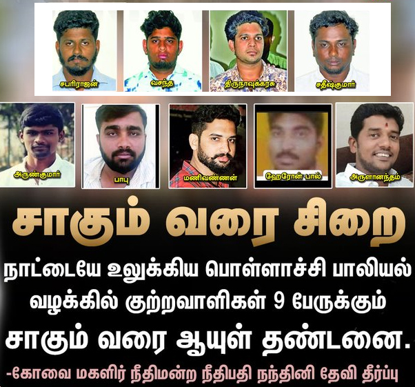 வழக்கில் கைது செய்யப்பட்ட 9 பேரும் குற்றவாளிகள் என தீர்ப்பு வழங்கிய கோவை மகளிர் நீதிமன்றம், அனைவருக்கும் சாகும் வரை ஆயுள் தண்டனை வழங்கியுள்ளது.