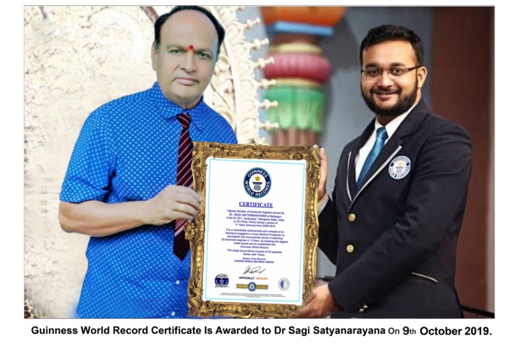 டாக்டர் சாகி சத்யநாராயண். உலகிலேயே அதிகபட்சமாக முனைவர் பட்டங்களைப் பெற்ற சிறந்த மனிதர் அவர். இவர்களில் 15 பேர் அறிவியல் டாக்டர்கள். 25 பேர் இலக்கிய டாக்டர்கள், 71 பேர் தத்துவ டாக்டர்கள். இந்த சாதனைகள் அனைத்தும் வெறும் 41 ஆண்டுகளில் அடையப்பட்டுள்ளன.