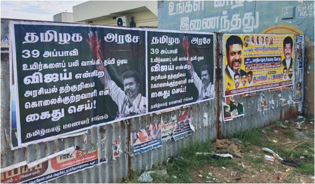 கரூரில் தவெக தலை​வர் விஜய் பிரச்​சா​ரக் கூட்ட நெரிசலில் உயி​ரிழந்​தவர்​கள் எண்​ணிக்கை 41 ஆக அதி​கரித்​துள்​ள நிலையில் இந்தப் போஸ்டர் நகர் முழுவதும் பரவலாகப் பல இடங்களிலும் தென்படுகிறது.