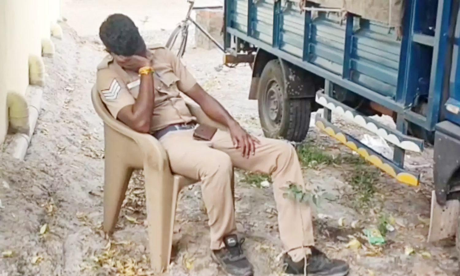 பின்னர் நிலை தடுமாறி கீழே விழுந்தார். இதனை கவனித்த அருகில் இருந்த மற்ற போலீசார் அவரை கைத் தாங்கலாக அழைத்து சென்று சாலையோரத்தில் இருந்த ஒரு வாகனத்தின் மறைவில் சேர் போட்டு அமர வைத்தனர்.