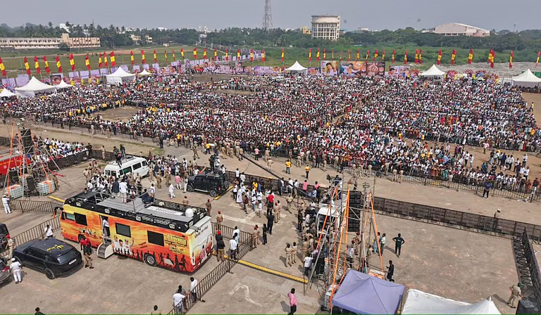 இதனால் எந்த நெரிசலுசம் இன்றி காலை 10.20 மணிக்கு விஜய் வாகனம் துறைமுக வளாகத்தை வந்தடைந்தது. காலை 10.30 மணிக்கு விஜய் பொதுகூட்டம் வளாகம் வருவார் என அறிவிக்கப்பட்டிருந்தது.