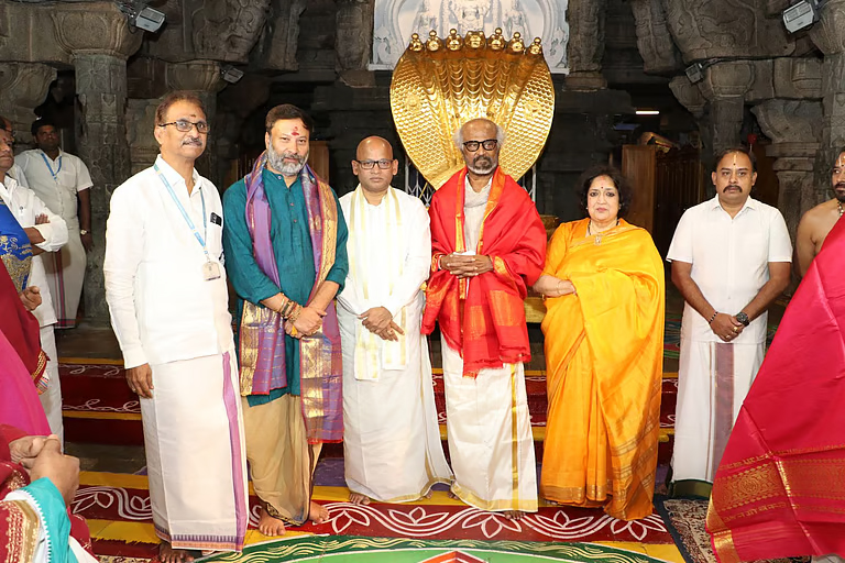 அதன் பின்னர் ஏழுமலையானை தரிசனம் செய்தனர். இதனை தொடர்ந்து ரங்கநாயக மண்டபத்தில் ரஜினிகாந்த் மற்றும் அவர்களது குடும்பத்தாருக்கு தேவஸ்தான அதிகாரிகள் தீர்த்த பிரசாதங்களை வழங்கி கவுரவித்தனர்.