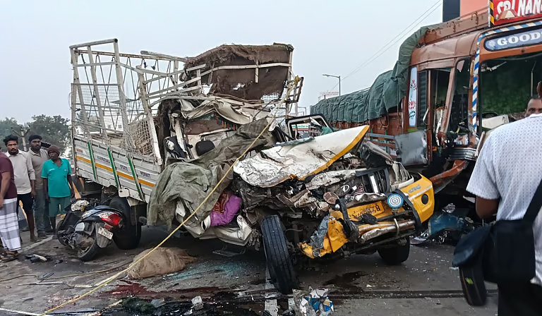நாமக்கல்-திருச்சி சாலை ரயில்வே மேம்பாலத்தில் இரண்டு சரக்கு வாகனங்கள் நேருக்கு நேர் மோதிக் கொண்ட விபத்தில் 3 பேர் உயிரிழந்தனர்.