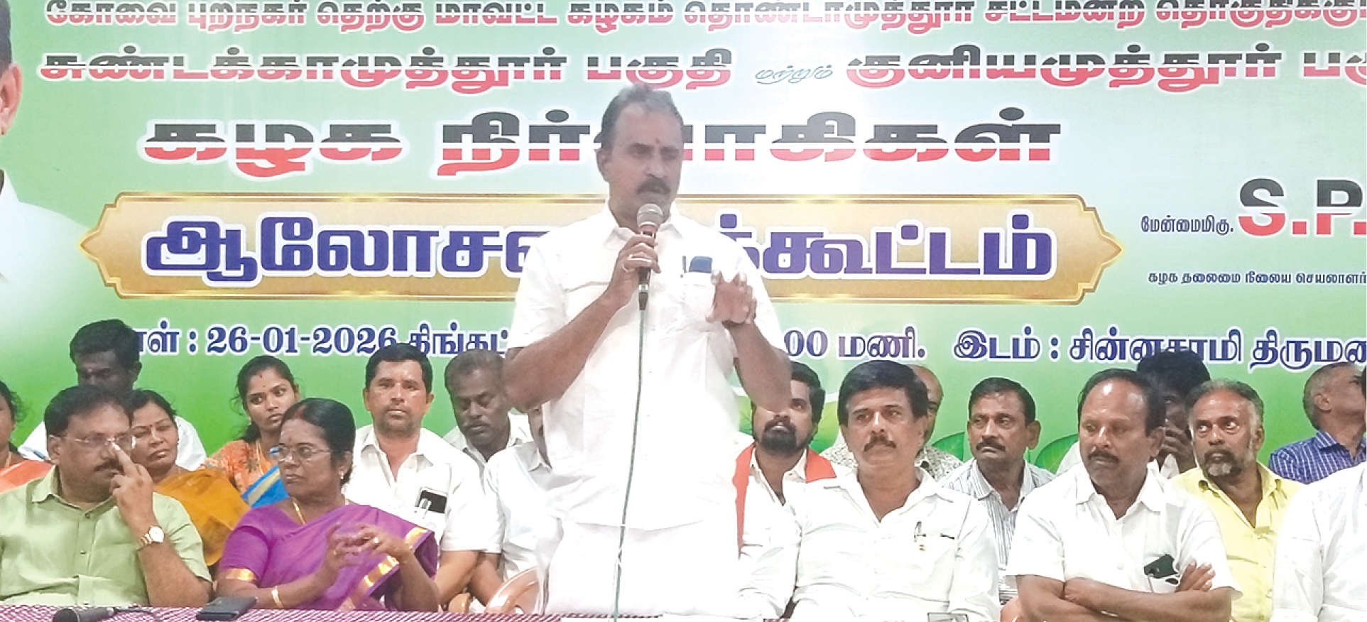 இந்தக் கூட்டங்களில் பங்கேற்ற எஸ்.பி.வேலுமணி, தேர்தல் பணிகளை களத்தில் எவ்வாறு முன்னெடுக்க வேண்டும் என்பது குறித்து விரிவாக ஆலோசனை வழங்கினார். குளத்துபாளையம் பகுதியில் நடைபெற்ற கூட்டத்தில் பேசிய அவர், கடந்த மூன்று மாதங்களாக எஸ்ஐஆர் பணிகளை சிறப்பாக மேற்கொண்ட நிர்வாகிகளை பாராட்டி கௌரவித்தார். தேர்தல் விரைவில் நடைபெறவுள்ளதால் அனைவரும் கூடுதல் கவனத்துடன் செயல்பட வேண்டும் என்றும் தெரிவித்தார்.