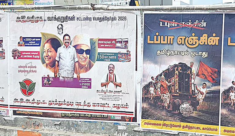 ‘டபுள் எஞ்சின் – டப்பா எஞ்சின் தமிழ்நாட்டில் ஓடாது… அடிமைகளை விரட்டுவோம் தமிழ்நாட்டைக் காப்போம்’ என்ற வாசகங்கள் பளிச்சிடும் அந்த போஸ்டரில், ஒரு ரயிலில் பிரதமர் மோடி, பழனிசாமி, தினகரன், ஜி.கே.வாசன், அன்புமணி உள்ளிட்டோர் தொங்குவது போன்ற படங்களை சித்தரித்திருக்கிறார்கள்.