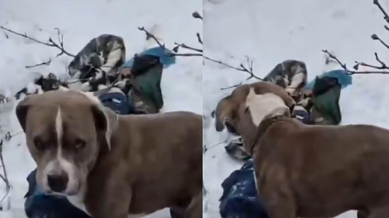 கடும் குளிர், அதிக அளவில் பனிப்பொழிவு இருந்தபோதும் 4 நாட்களாக சடலங்களை விட்டு அகலாமல் அந்த நாய் அங்கேயே நின்று கொண்டிருந்தது.
