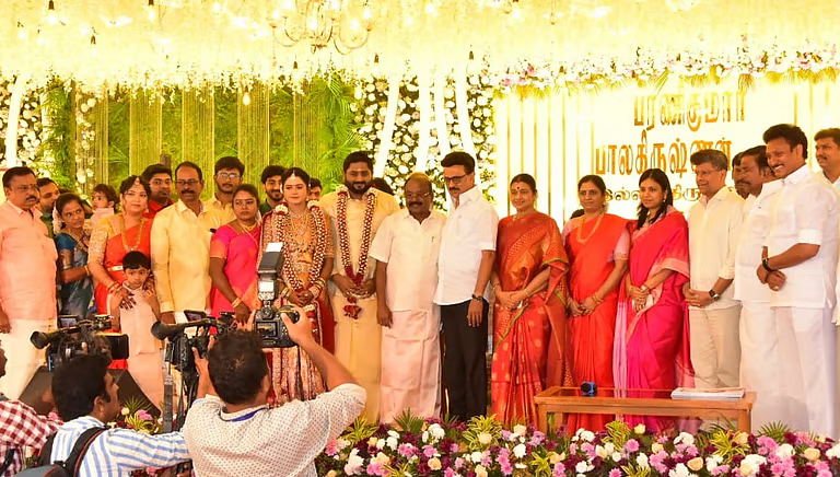 திருச்சி கலைஞர் அறிவாலயத்தில் திருச்சி முன்னாள் நகர்மன்ற தலைவர் பாலகிருஷ்ணனின் பேரனும், முன்னாள் திமுக எம்எல்ஏ பரணிகுமாரின் மகனுமான ஆதித்யா பாலா – மீனாட்சி ஆகியோரின் திருமணத்தை முதல்வர் ஸ்டாலின் தலைமையேற்று நடத்தி வைத்தார்.