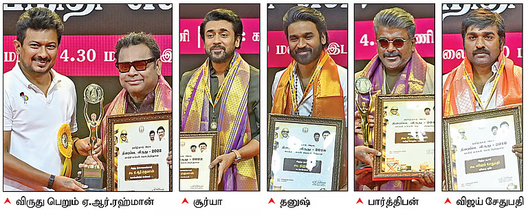 தமிழக அரசின் சார்பில் 2016 முதல் 2022-ம் ஆண்டுகளுக்கான திரைப் பட விருதுகள், 2014 முதல் 2022-ம் ஆண்டுகளுக்கான சின்னத்திரை விருதுகள் மற்றும் 2015-16-ம் கல்வி ஆண்டு முதல் 2021-22-ம் கல்வி ஆண்டுகளுக்கான தமிழ்நாடு அரசு எம்ஜிஆர் திரைப்படம் மற்றும் தொலைக்காட்சி பயிற்சி நிறுவன மாணவர் விருதுகள் கடந்த மாதம் அறிவிக்கப்பட்டன.