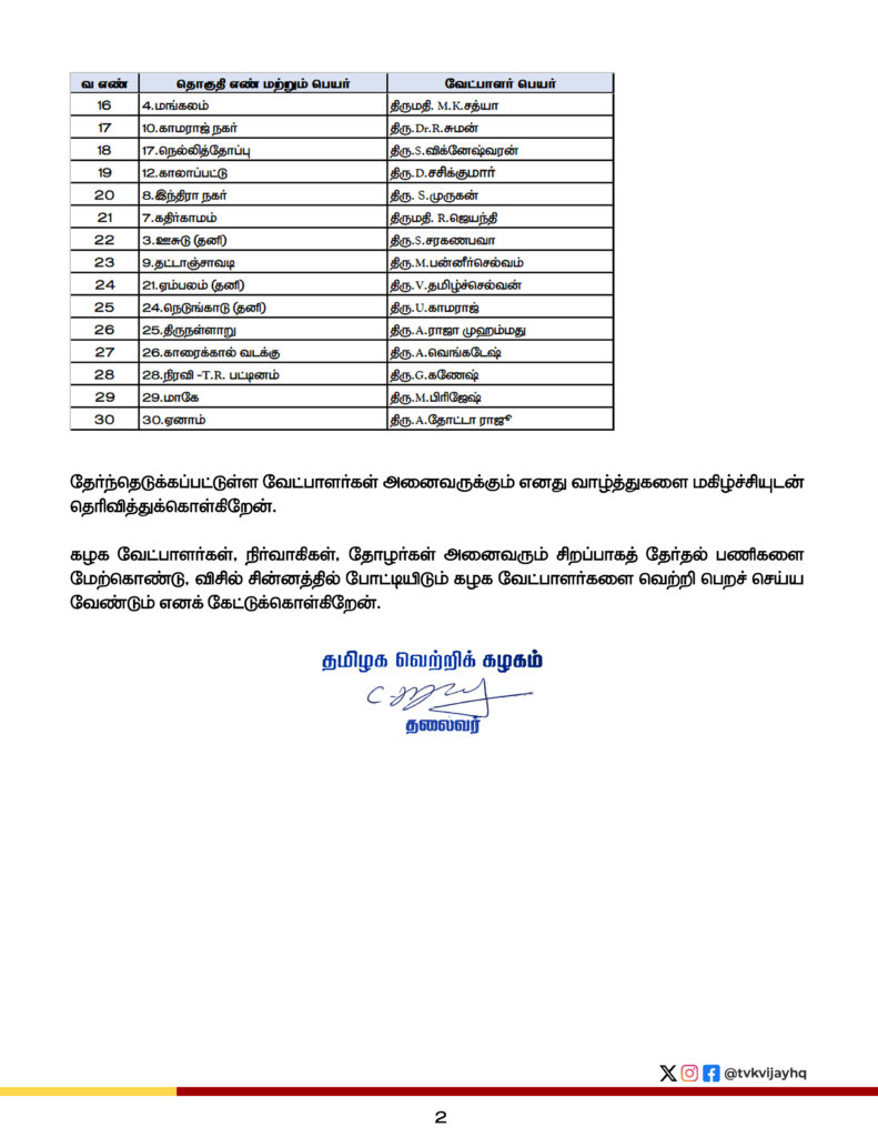 தேர்ந்தெடுக்கப்பட்டுள்ள 30 வேட்பாளர்களுக்கும் தனது வாழ்த்துகளைத் தெரிவித்துள்ள விஜய், கழக நிர்வாகிகள் மற்றும் தொண்டர்கள் அனைவரும் ஒருங்கிணைந்து தேர்தல் பணிகளை மேற்கொள்ள வேண்டும் என அறிவுறுத்தியுள்ளார்.