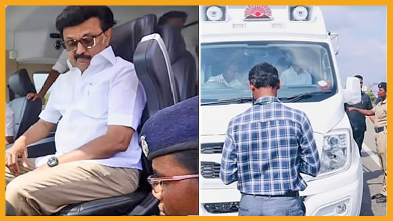 இந்த வாகனத்தில் அமைச்சர்கள் கே.என்.நேரு, டி.ஆர்.பி. ராஜா உள்ளிட்டோரும் உடன் இருந்தனர். தஞ்சாவூர் அருகே சாலியமங்கலம் நாலுரோடு பகுதியில் வாகனம் சென்றபோது அங்கு தேர்தல் பறக்கும்படை அதிகாரிகள் முதல்வரின் வாகனத்தை நிறுத்தி சோதனை செய்தனர்.