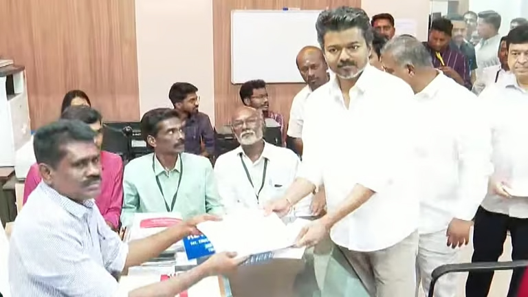 அதனால் வேனில் அமர்ந்தபடியே காத்திருந்தார். சுயேட்சையின் வேட்புமனு தாக்கல் முடிந்தபிறகு, தேர்தல் நடத்தும் அலுவலரும், மாநகராட்சி உதவி ஆணையருமான முத்து முருகேச பாண்டியிடம் விஜய் தனது வேட்பு மனுவை தாக்கல் செய்தார்.