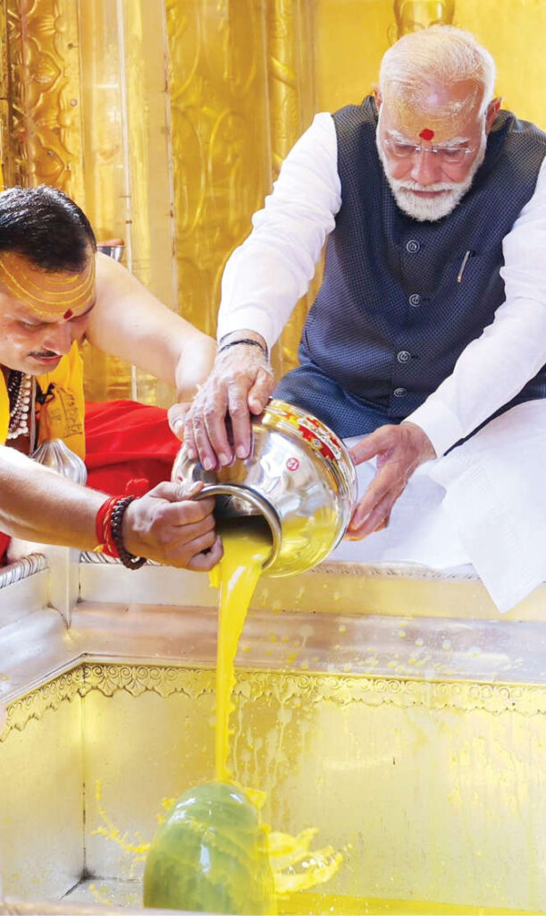 பிரதமரை வரவேற்கும் வகையில், பக்தர்கள் மற்றும் ஆதரவாளர்கள் “ஹர ஹர மகாதேவ்” மற்றும் “ஜெய் ஸ்ரீ ராம்” போன்ற முழக்கங்களை எழுப்பினர்.